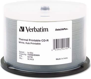 Verbatim 94795 700 Mb/80 Min 52X Spindle Hub Printable Cd-R Datalifeplus Printable Recordable Disc - White (50/Pack)
