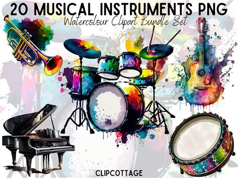 20 Musical Instruments Watercolour Clipart PNG Illustrations Bundle For Sublimation, T-Shirts, And POD Products With Commercial Licence
