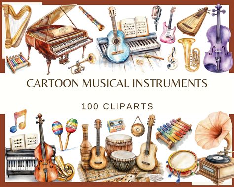 Watercolor Cartoon Musical Instrument Clipart: 100 PNG Graphics