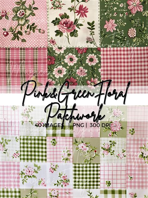 Pink & Green Patchwork Seamless Patterns, Floral Grand Millenial Patterns, Cute Quilted Pattern PNG Bundle Gingham Polka Dots Digital Papers